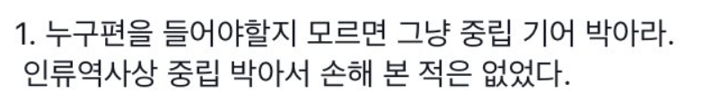 많은 사람들이 섵부르게 판단하여 이야기를 하고, 결론을 지으며, 이후 누군가를 비난합니다. 과연 이러한 것들이 맞는 일일까요? 무언가 섵부른 판단을 하고 잘못된 판단임이 밝혀져도 '아몰랑'하고 넘어가는 것은 굉장히 좋지 않다고 생각합니다. 했던 욕들은 이미 누군가에겐 상처를 입혔을 수도 있으니까요. 이번 포스팅에서는 중립기어라는 드립에 대해서 알아보는 시간을 가져봤고, 모두 섵부르게 판단하지 말고 중립기어를 박는, 또는 그냥 댓글을 안쓰는 것을 추천드리며 포스팅 마치도록 하겠습니다. :)