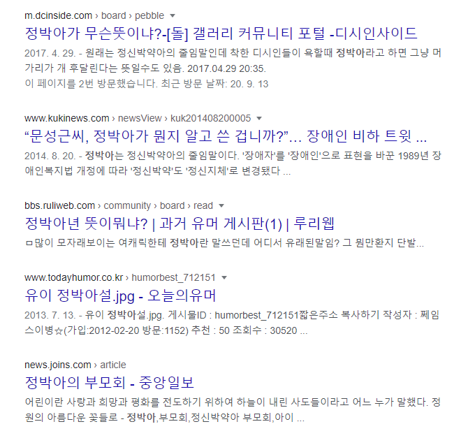 이번 포스팅에서는 인터넷에서 어떠한 사건, 상황으로 화가나서 화나게 한 원인을 제공한 사람을 욕할 때 주로 사용되는 말인 정박아라는 말에 대해서 알아보려고 합니다. 사실 그렇게 좋은 단어는 아니므로 이 글을 보는 사람들은 웬만하면 뜻만 무슨 뜻인지 알고 사용은 하시지 않는 것을 권장드립니다. 그럼 알아보도록 하죠.