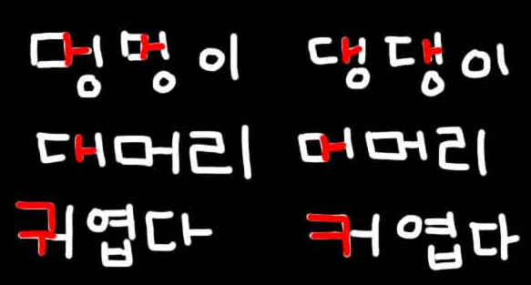 야민정음은 '명'을 '띵'으로 치환하는 것 외에도 다양하게 사용되는데요, 위의 이미지 자료처럼 '멍멍이'를 '댕댕이'로 '대머리'를 '머머리'로, '귀엽다'를 '커엽다'로 사용하는 등이 있습니다. 그 외에도 '근'이라는 문자가 'ㄹ'과 비슷한 것을 이유로 '박근혜'를 '박ㄹ혜', '근황'을 'ㄹ황'과 같이 드물게 표현하기도 합니다. 이러한 야민정음 중에서 '멍멍이'를 표현하는 말인 '댕댕이'는 다른 야민정음들과 달리 사용하는게 인터넷에서만 국한되지 않고 현실에서도 많이 표현됩니다.