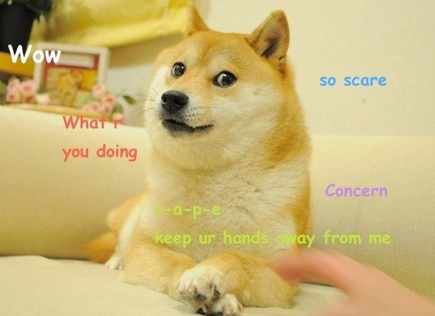 바로 위 사진이 시바견 밈의 원본 사진인데요, 이 사진은 2010년 2월 일본의 한 유치원 교사 사토 아츠코가 기르는 시바견의 사진이 2013년 하반기 미국 인터넷에서 유행하게 되었습니다. 유행하게 된 이유는 시바견의 표정에 있는데요, 약간 새침한 듯 하면서도 똘망똘망한, 개치고는 특이한 표정 때문이죠. 여기서 누군가가 doge라는 말을 붙여서 이 개의 사진을 공유하기 시작했고, 결과적으로 이 개는 doge라는 별명을 얻게 되었죠. 우리나라에서도 멍멍이를 멍뭉이라고 표현해도 다 알아듣는 것 마냥 비슷한 이치라고 생각하시면 됩니다.