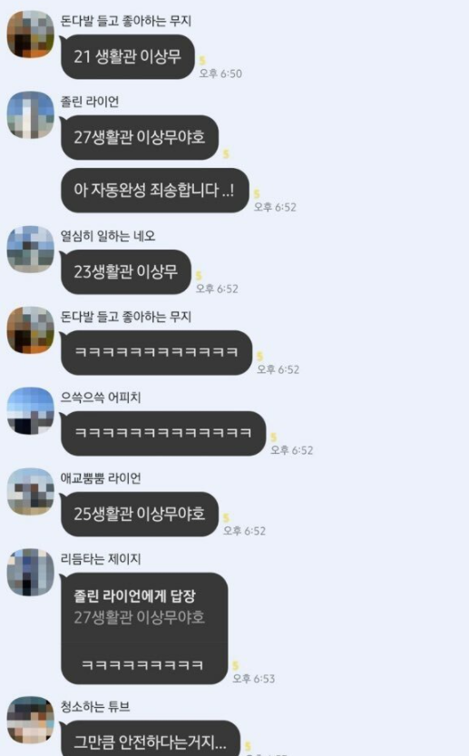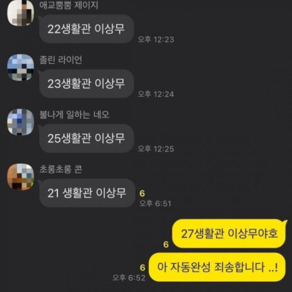 군대에서 점호를 하고 있는데 본래라면 위에처럼 "XX생활관 이상무"라고 작성해야 되는데 아이폰의 자동완성 기능 때문에 "27생활관 이상무야호"라고 입력이 되었고, 이를 그대로 전송하여 자동완성 죄송하다고 전했죠. 거기에 마지막에 다른 사람이 "그만큼 안전하다는거지..."라고 정형돈의 "그만큼 신나시는 거지"를 완벽하게 패러디하여 큰 웃음을 주기도 했습니다.