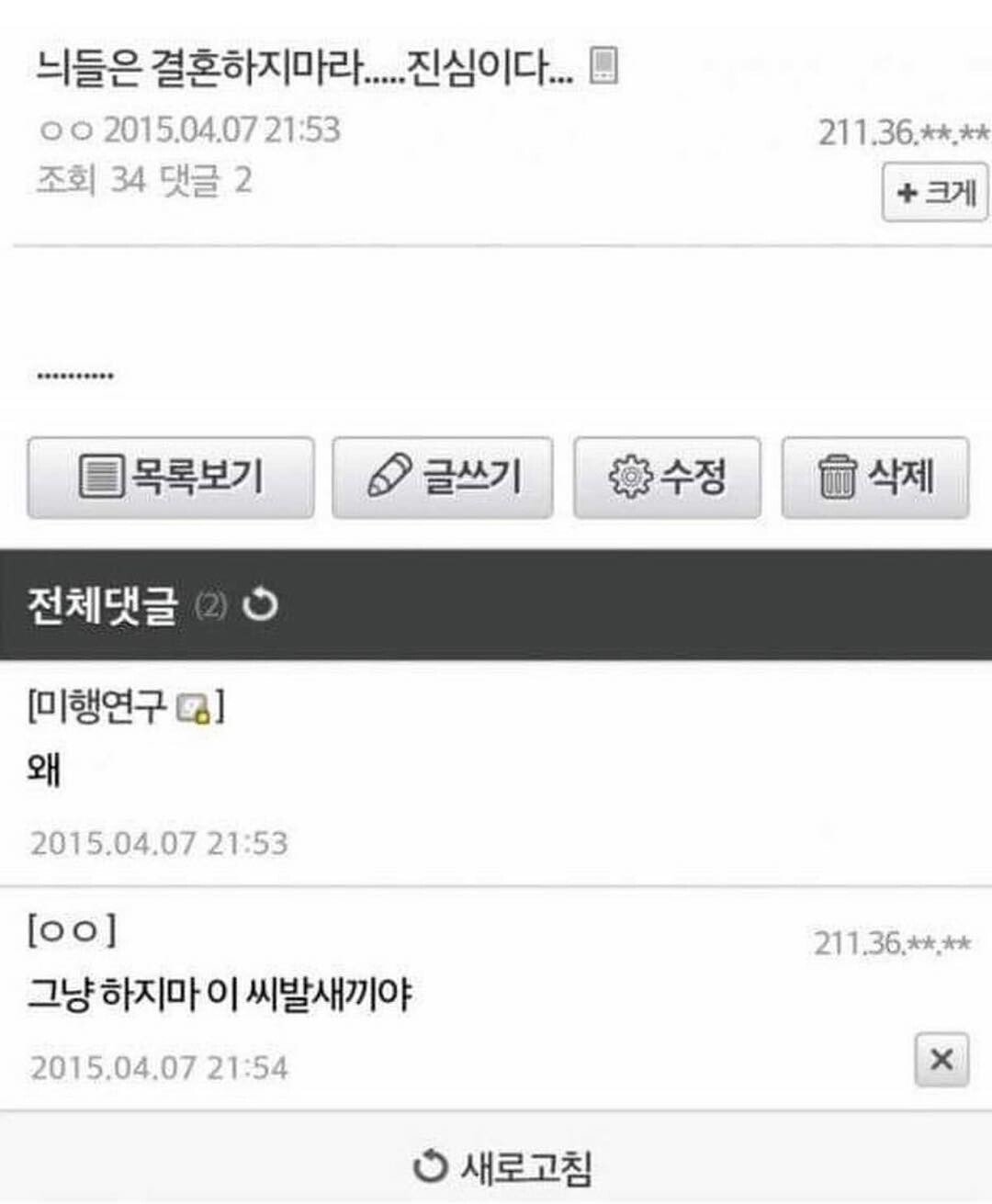 원본은 인터넷 커뮤니티 디시인사이드에 2015년 4월 7일 올라온 한 글입니다. 누군가가 제목을 '늬들은 결혼하지마라.....진심이다...'라고 게시글을 작성하는데요, 내용에는 별다른 이유가 적혀져 있지 않았습니다. 이를 궁금해한 다른 한 사람이 댓글로 "왜"라고 짧막하게 달자 바로 글쓴이는 '그냥 하지마 이 씨X새X야'라고 욕설과 함께 분노를 표출하죠. 이 짧지만 강렬한 대화는 사람들에게 큰 웃음을 주며 여러 커뮤니티로 퍼져나갔습니다.