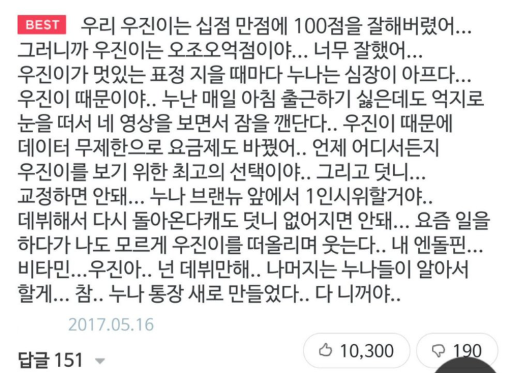 오조오억이라는 말의 유래는 바로 위의 이미지로부터 시작했습니다. 과거 프로듀스 101 시즌2가 진행되었을 때 참가자중 한 명인 박우진의 무대를 보고 난 뒤 굉장히 칭찬하면서 "우리 우진이 오늘도 십점 만점에 오조오억점이야"라는 말을 했고 그와 동시에 뭔가 의식의 흐름대로 쓴 듯한 내용들이 많은 좋아요를 받게 되었습니다. 이는 연예인 덕질을 하는 사람들과 코드가 잘 맞아떨어졌고 그러면서 해당 내용중의 '오조오억'이라는 표현이 자주 사용되게 되었습니다.