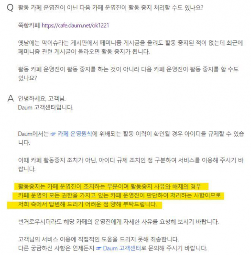 사람들이 이에 의아해하고 다음에도 민원을 넣어 확인해본 결과 실질적으로 카페 운영진이 활동중지를 시켰다는 것을 알 수 있습니다. 사실상 쭉빵카페는 역사에서도 설명했듯 페미니즘 성향의 카페가 되었다고 말을 했는데 운영진이 페미니즘 관련 글을 올리면 활동중지를 시킨다는 것을 알게 된 회원들은 분노하게 됩니다.