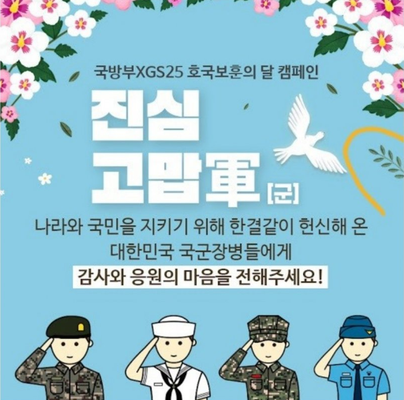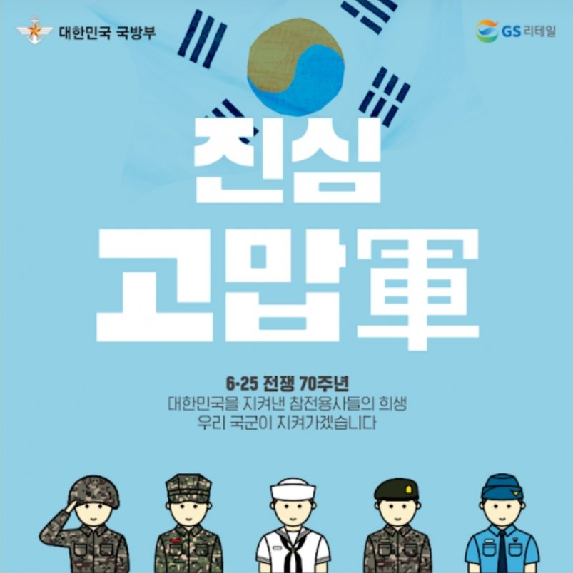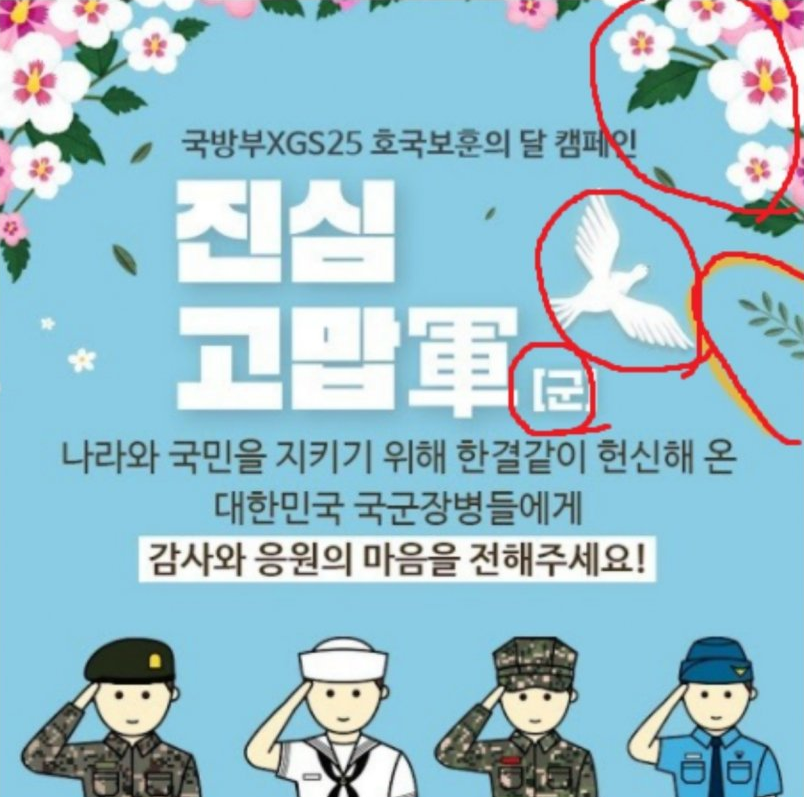 국방부는 GS리테일과 더불어 625전쟁 70주년 캠페인을 열었습니다. 왼쪽이 국방부에서 제작하여 배포한 것이고 오른쪽이 GS에서 제작해서 배포한 것이죠. GS에서 제작해서 배포한 것을 확인해보면 원본에는 없는 무궁화와 새, 그리고 뜬금없는 이파리가 함께 있는 것을 볼 수 있습니다.
