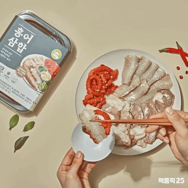 홍어삼합 제품 홍보인데 전혀 상관없는 월계수 잎과 고추가 잘려진 모습이 그려져 있습니다.