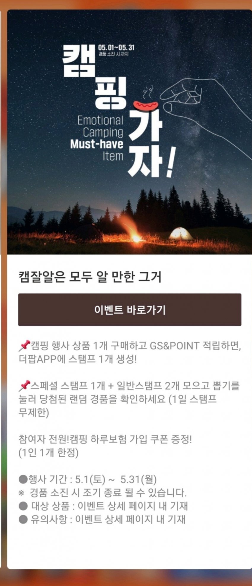 먼저 GS25는 위와 같이 캠핑 이벤트를 진행합니다. 바로 이 이벤트 포스터에서 문제가 되었는데요, 얼핏 보면 그냥 평범한 포스터처럼 여겨집니다. 그렇다면 과연 어느 부분이 남혐을 조장한다는 것일까요?