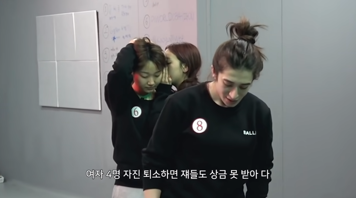 2번과 6번이 감정을 내세워 욕을 해봐도 4번이 굽히고 들어가는 모습을 보이기는 커녕 오히려 다 맞받아치니 그냥 대화를 포기하려는 찰나 5번 참가자 이루리가 6번에게 귓속말로 "여자 4명 자진 퇴소하면 쟤들도 상금 못 받아 다"라고 귀띔을 해줍니다. 실제 규칙에서도 총 4명 이상의 참가자가 자진 퇴소시 게임은 그 즉시 종료될 수 있으며 이 경우 모든 참가자들은 상금을 수령할 수 없다고 나와있었죠.