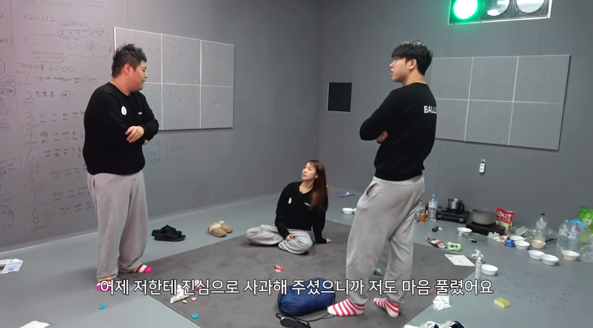 여성 참가자들은 집단 퇴소 후에 파주에 위치한 파이의 자택에서 니갸르를 제외한 여성 참가자들끼리 랍스터를 먹고 있었다고 합니다. 남성 참가자들은 스튜디오 근처 모텔에 있었구요. 사실 머니게임이 이대로 끝나게 된다면 머니게임을 제작하는데 투자한 기업들도 굉장히 손해를 보는 것이고 또 이런 것들을 기획한 진용진 역시 이렇게 초창기에 끝난다면 타격을 입을 수 있었죠. 이 이후 6번은 진용진, 머니게임 PD, 1번 참가자를 새벽 2시에 서울에서 파주까지 불러내어 무릎을 꿇게 하고 사과시켰다고 합니다. 1번 참가자의 경우 남성 참가자들이 있던 모텔에 눈물을 흘리면서 들어와서 본인만 참으면 프로그램에 문제가 없겠다 싶었다고 생각하여 무릎을 함께 꿇었다고 합니다. 또한 니갸르를 제외한 여성 참가자들은 이때 추후 서술할 상금 N빵을 기획한 것으로 판단됩니다.