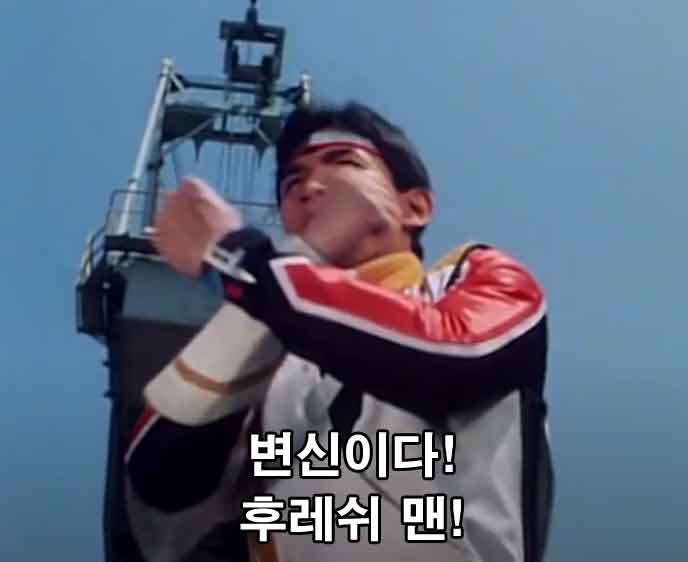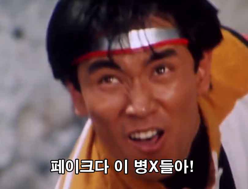 먼저 유래는 매너방위대입니다. 매너방위대의 원본은 일본의 초신성 플래시맨이라는 애니메이션을 편집과 더빙으로 막장으로 만든 것인데요, 우선 초신성 플래시맨에는 해당 대사가 없고 상황도 완전 다른 상황입니다. 그렇기 때문에 초신성 플래시맨을 패러디한 매너방위대가 '페이크다 이 병X들아' 밈의 원본이라고 할 수 있겠네요. 위의 영상을 보면 알 수 있듯이 주인공인 1호기가 변신을 하는 척 하다가 "페이크다 이 병X들아!"라고 대사를 치며 도망갑니다.