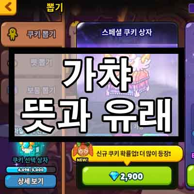 가챠는 일본어 ガチャガチャ(가챠가챠)에서 유래되었습니다. 해당 일본어는 동전을 넣고 돌리는 뽑기 기계따위에서 나는 소리따위를 나타내는 의성어인데요, 우리나라 말로 치면 '철컥철컥' 또는 '절그럭절그럭'정도가 가장 적당한 것 같네요. 이렇듯 기계의 소리를 나타내는 의성어지만 대체적으로 뽑기 기계에서 쉽게 들을 수 있기 때문에 가챠라는 말은 일본에서도 뽑기라는 말을 의미하게 되었습니다. 그리고 그 말이 국내로 넘어온 것이구요.