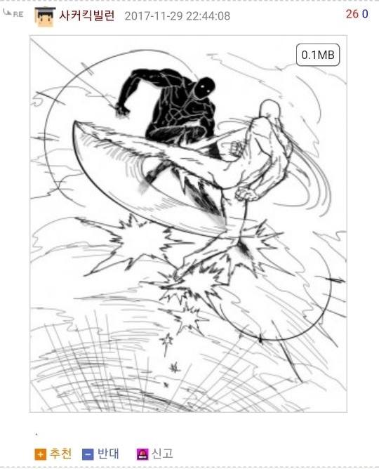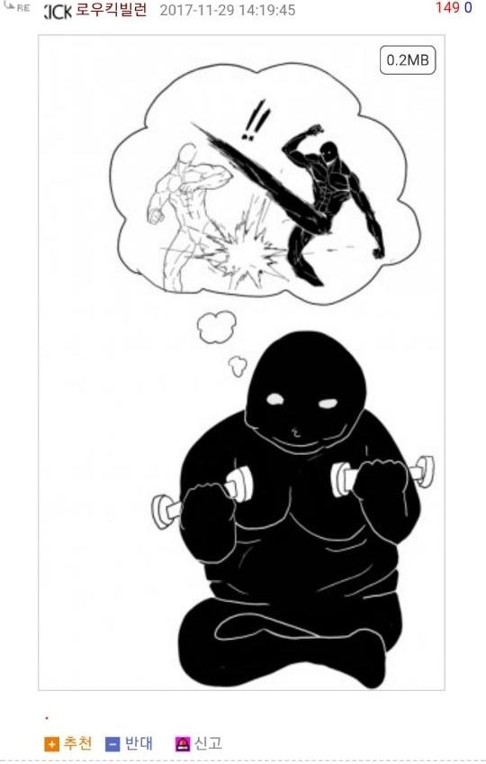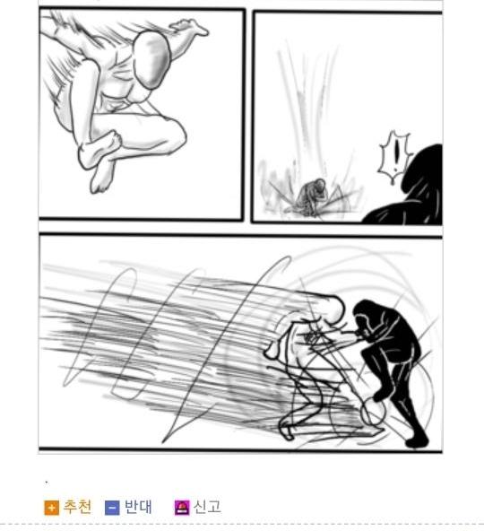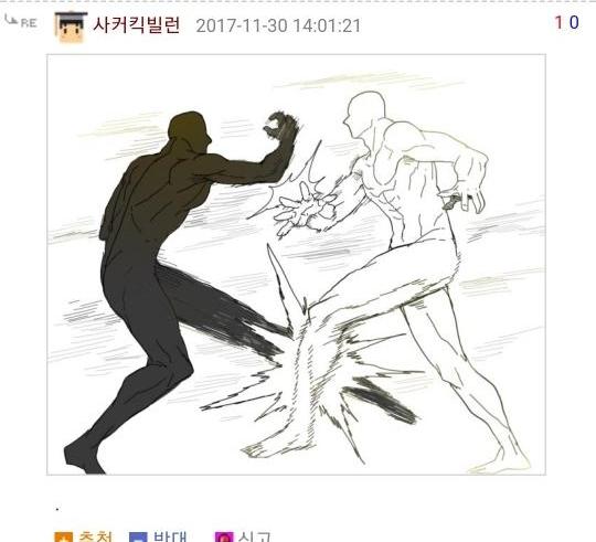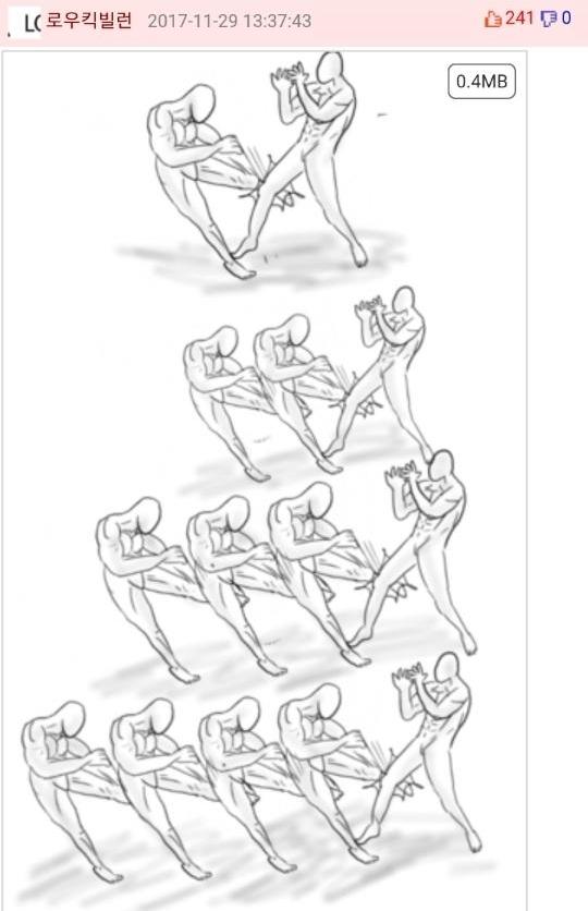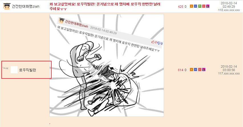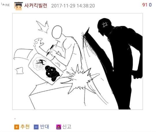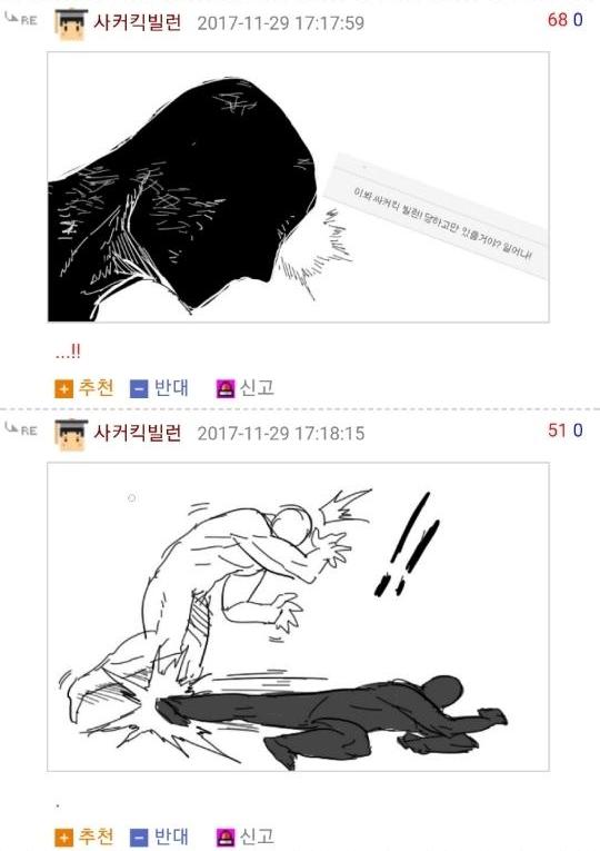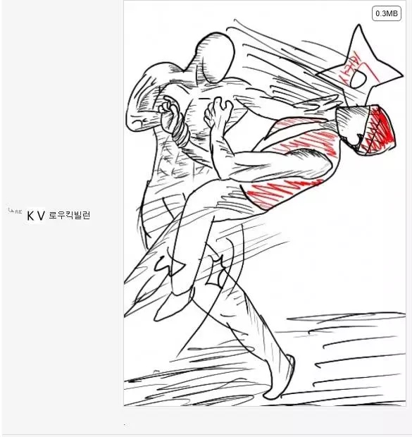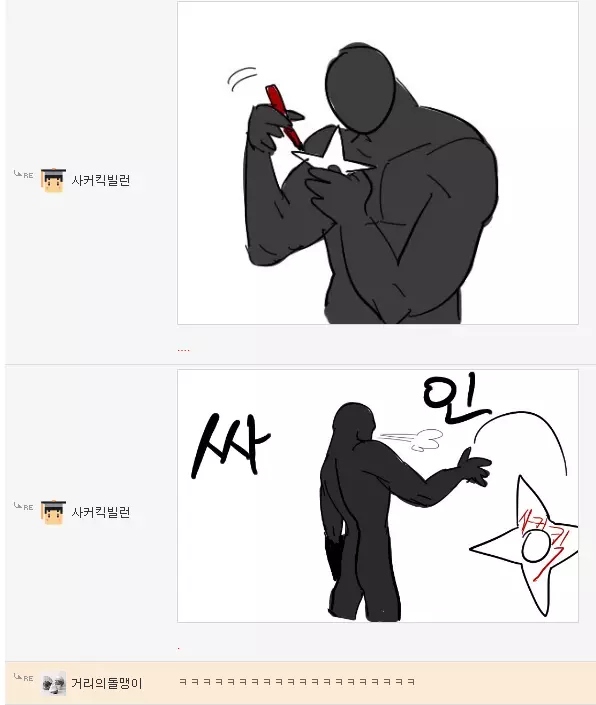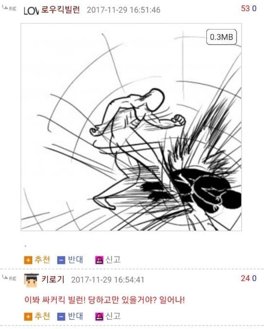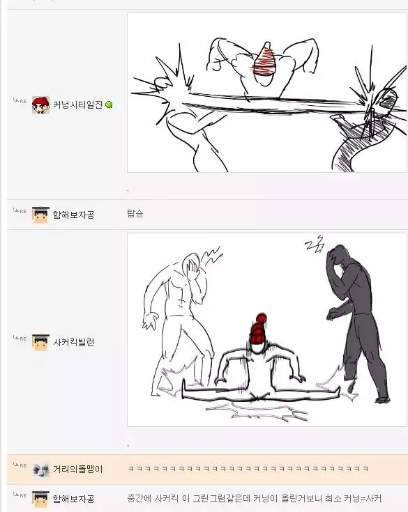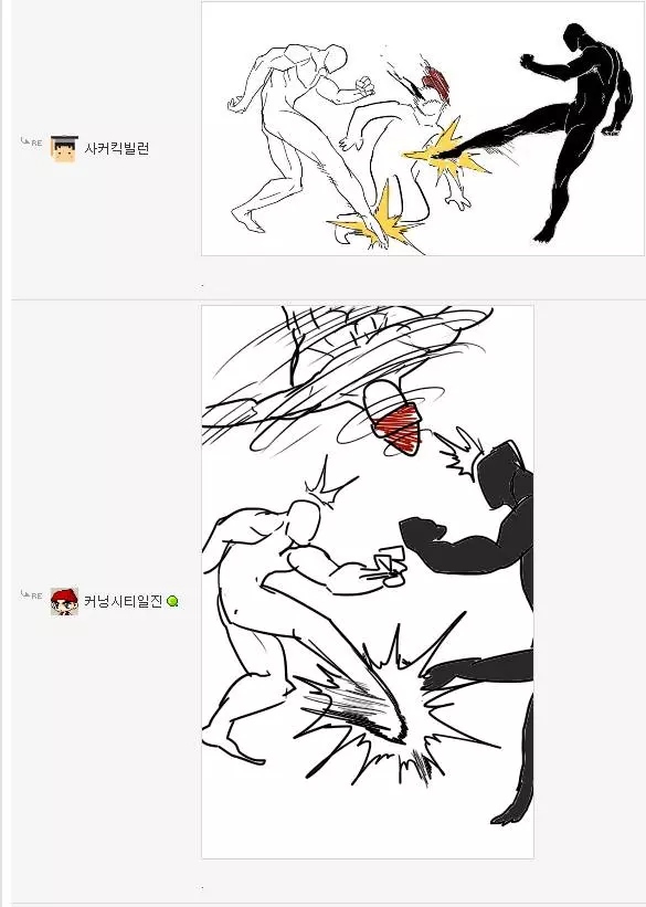 먼저 로우킥빌런은 웃긴대학이라는 인터넷 커뮤니티에서 활동하는 한 유저의 닉네임입니다. 그는 닉네임에 걸맞게 다른 사람들의 게시글에 댓글로 저런 로우킥을 날리는 모습의 그림을 직접 그려 자주 올렸었죠. 그래서 나름 알고 있는 사람도 꽤나 있었고 보는 사람들도 다 유쾌하게 받아들였습니다. 그런 로우킥빌런의 앞에 갑자기 '싸커킥빌런'이라는 닉네임을 가진 유저가 나타나게 되는데...