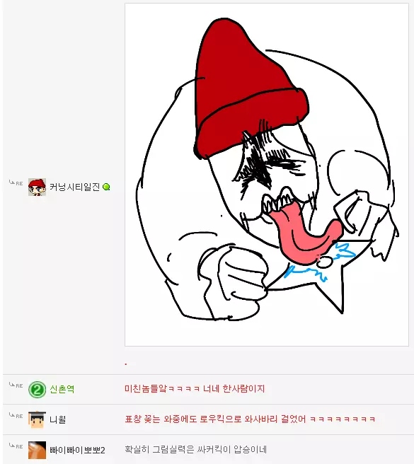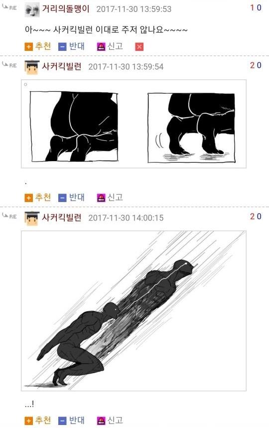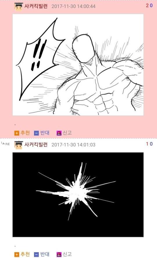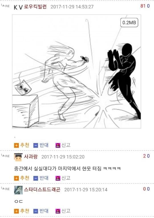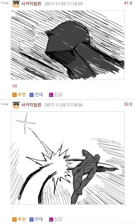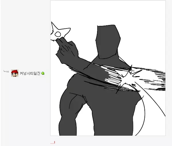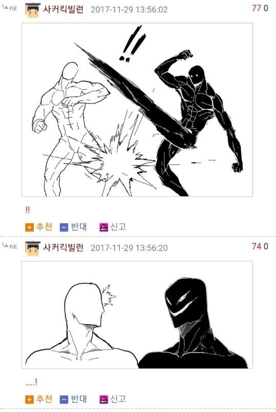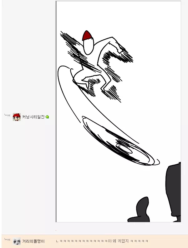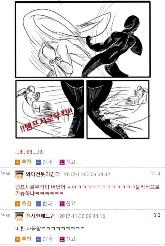 댓글 답글로 실시간으로 그림을 그려가며 저렇게 내용을 이어가는 모습은 마치 하나의 만화를 보는 듯 했고 내용 역시 굉장히 유머있는 모습을 보여줘서 큰 인기를 끌었습니다. 또한 복싱의 기술중 하나인 '뎀프시롤'을 '뎀프시로우킥'이라고 바꿔서 사용하는 것 역시 많은 사람들에게 웃음을 주었죠. 두 사람이 릴레이로 만화를 그린듯한 모습, 그리고 웃긴 내용, 마지막에 난입한 커닝시티일진까지 합류하여 나온, 어떻게 보면 하나의 작품이라고 할 수 있겠죠?
