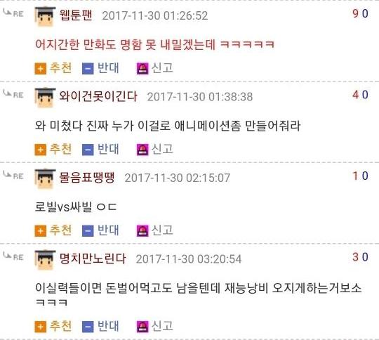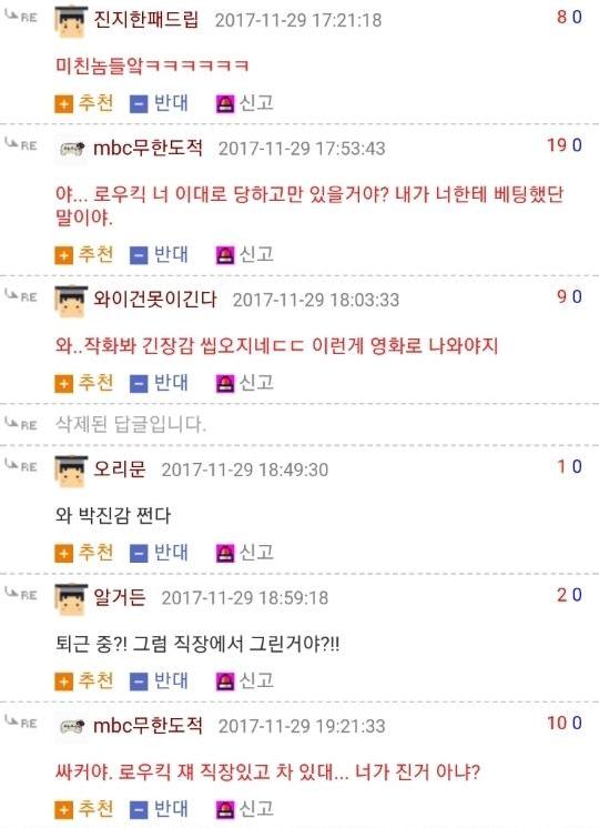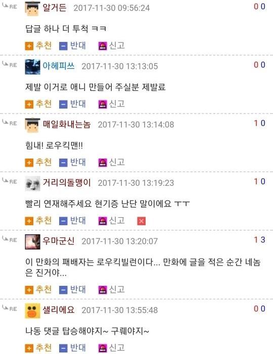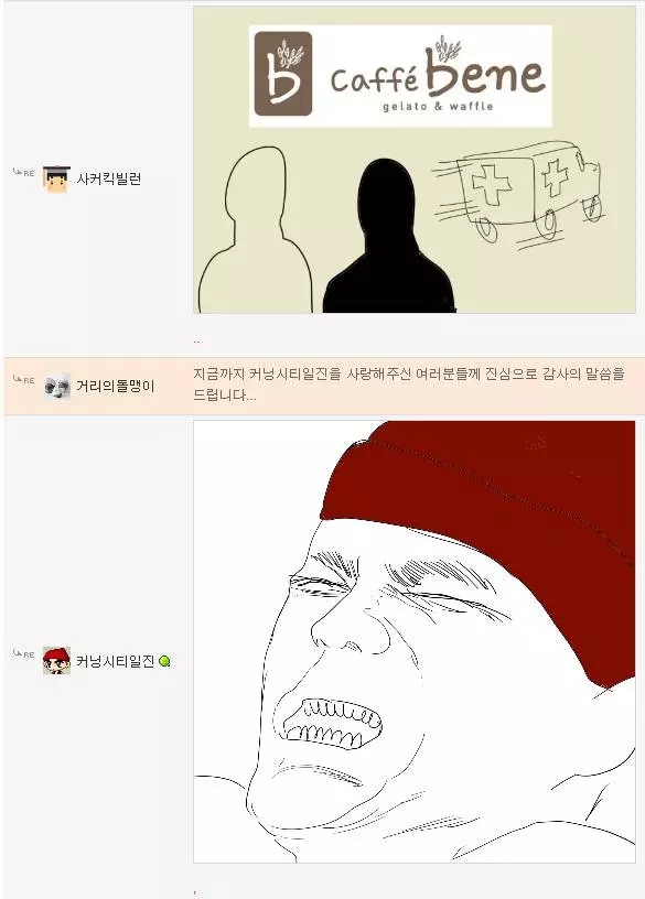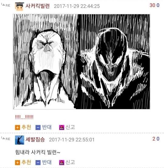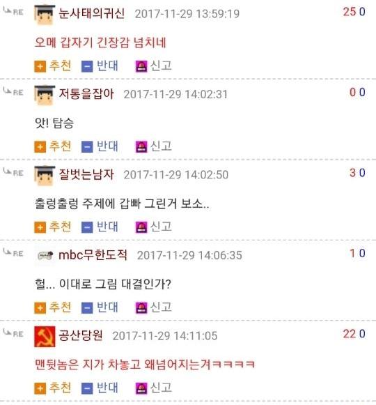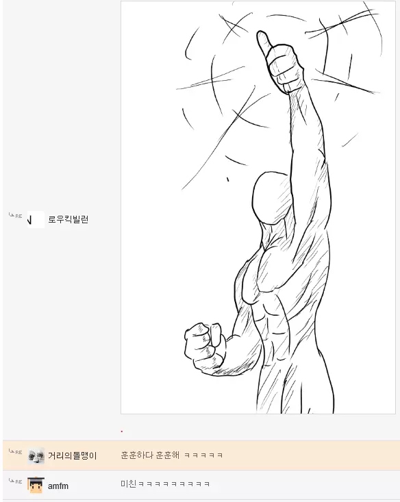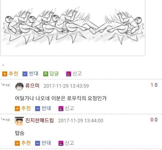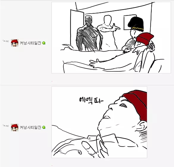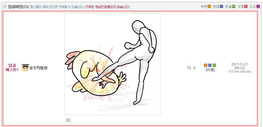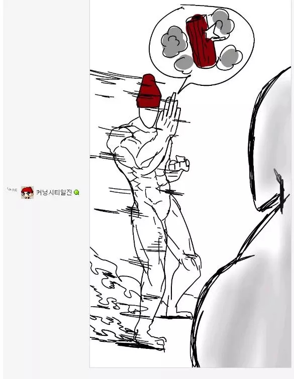 댓글 답글로 실시간으로 그림을 그려가며 저렇게 내용을 이어가는 모습은 마치 하나의 만화를 보는 듯 했고 내용 역시 굉장히 유머있는 모습을 보여줘서 큰 인기를 끌었습니다. 또한 복싱의 기술중 하나인 '뎀프시롤'을 '뎀프시로우킥'이라고 바꿔서 사용하는 것 역시 많은 사람들에게 웃음을 주었죠. 두 사람이 릴레이로 만화를 그린듯한 모습, 그리고 웃긴 내용, 마지막에 난입한 커닝시티일진까지 합류하여 나온, 어떻게 보면 하나의 작품이라고 할 수 있겠죠?