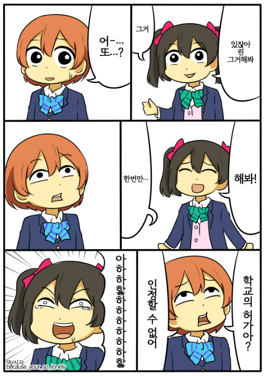 원본은 일본 애니메이션 러브라이브 1기 7화에서 나온 대사인 "학교의 허가 인정할 수 없어"에서 파생된 패러디성 만화입니다.