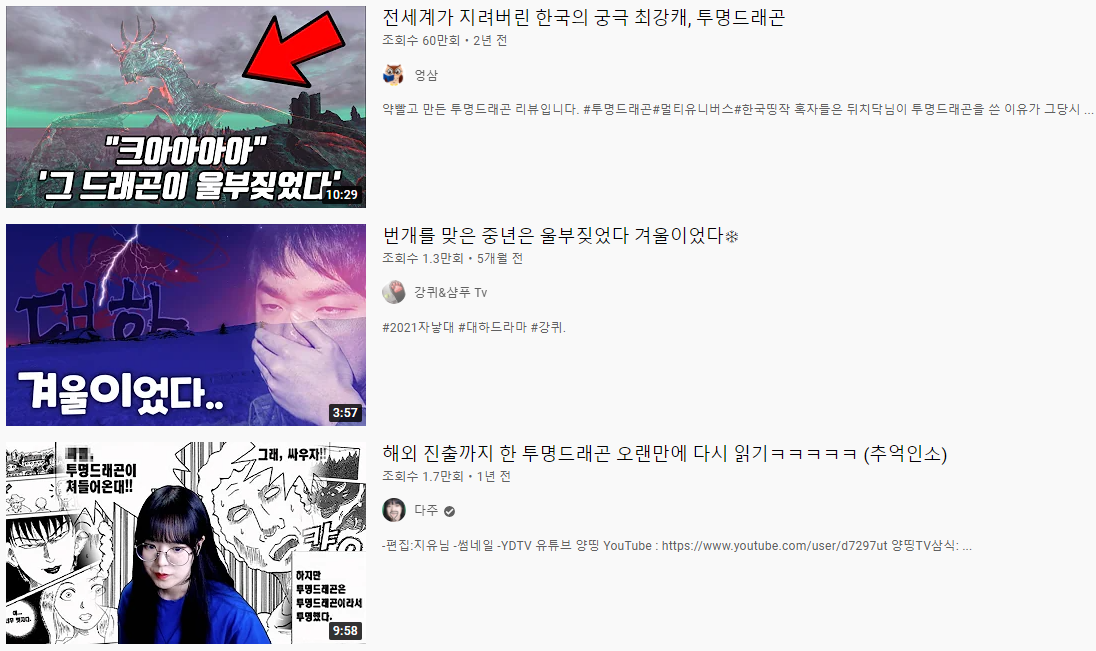 또한 1화 전문에서 '울부짖었다'라는 표현은 현재까지도 자주 사용되며 검색을 해보면 투명드래곤이 연관지어 나오는 경우가 대부분이고, 유튜브에 검색을 하여도 마찬가지로 투명드래곤 관련 영상들이 나오는 것을 볼 수 있습니다. 보통 이런 투명드래곤 관련 대사나 밈이 나온다면 십중팔구는 그게 굉장히 파격적이거나 강하다거나 하는 것을 묘사하는 밈입니다.