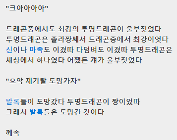 이렇게 이번 시간에는 투명드래곤에 대해서 알아보았습니다. 혹시 소설 전체를 보고 싶은 분들은 여기를 누르면 볼 수 있으며 2차창작으로 누군가 짧게 만화로 제작한 것은 여기를 통해 보면 되겠습니다. 그러면 이번 포스팅은 여기서 마무리하도록 하고 다음번에는 또 다른 글로 다시 찾아오도록 하겠습니다. :)