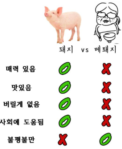 메퇘지라고 메갈리아 + 돼지의 합성어가 있습니다. 메퇘지는 멧돼지와 비슷하기도 하고 또 위에서도 말했듯 페미니스트들은 뚱뚱할 것이라는 인식으로 인해 생겨난 말이죠. 현재 남성혐오 커뮤니티인 메갈리아는 사라졌고, 그로 인해서 점차 사용하는 사람이 줄었습니다.