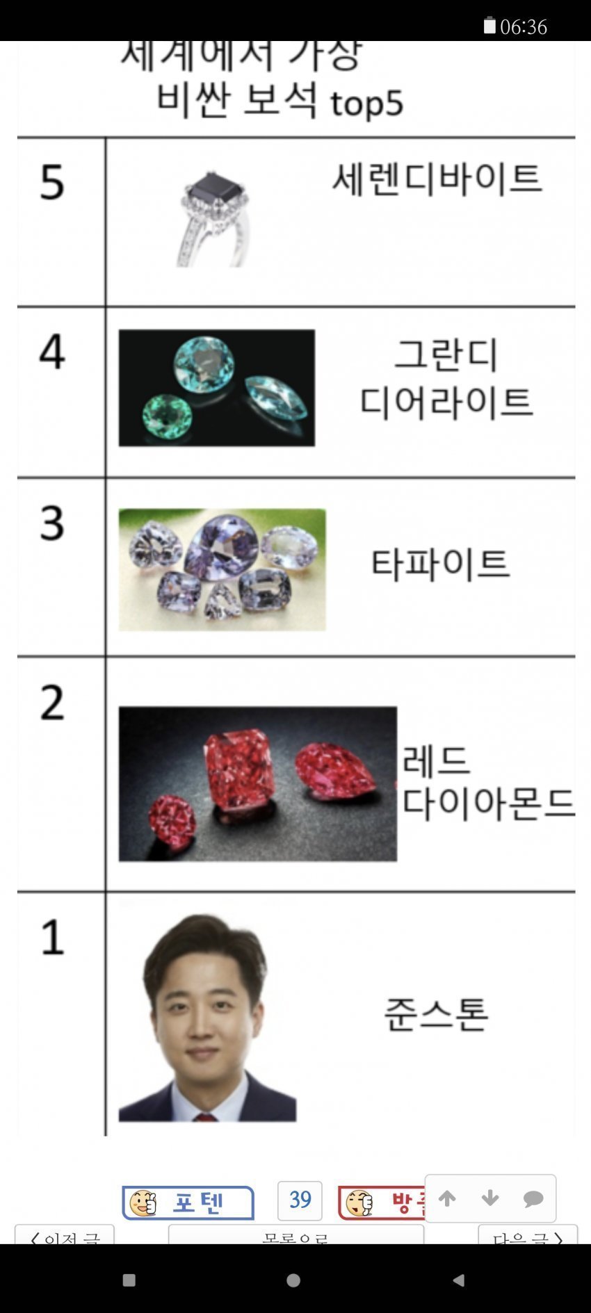 일부 네티즌들은 이러한 이준석의 별명을 보고 위의 이미지처럼 '세계에서 가장 비싼 보석 Top5'라며 1위에는 '준스톤'을 넣기도 했는데요, 해당 글은 많은 추천을 받았습니다. 아무래도 현재 이준석이 20대, 30대들로부터 큰 지지를 받고 있기 때문이겠죠? 또 몇몇은 '준스톤'이 무슨 뜻인지 몰라 물어보기도 했습니다.