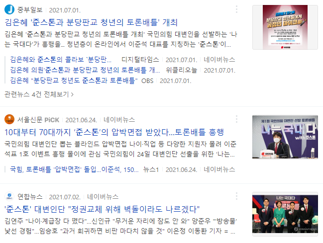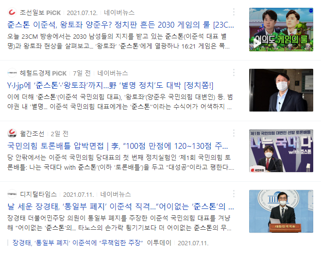 또 보면 알 수 있듯이 다양한 뉴스권에서도 이준석을 '준스톤'이라고 부르는 모습을 확인할 수 있습니다.