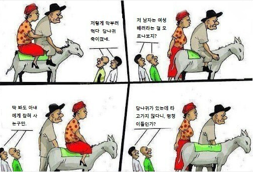 먼저 프로불편러에 대해서 알아야 됩니다. 프로불편러에 대해서는 이미 예전 글에서 소개한 적이 있지만 모르는 분들을 위해 짤막하게 설명해드리자면 별거 아닌 것에도 불편을 표하는 사람을 뜻합니다. 위의 짤을 보면 알겠지만 당나귀에 두 사람이 타고 가는데 그걸 보고 당나귀를 죽이겠다며 불편하고, 그래서 남성만 탔더니 여성 배려를 모른다며 불편하고, 여성만 탔더니 아내에게 잡혀산다고 불편을 표하고, 결국 둘 다 내려서 당나귀를 끌고 가자 왜 타고가지 않냐며 불편을 표하죠. 이렇게 뭐든지 불편을 표하는 사람들을 프로불편러라고 합니다. 특히나 여초 인터넷 커뮤니티에서는 "언냐, 이거 나만 불편해?"라는 제목으로 글이 자주 올라왔던터라 "이거 나만 불편해?"는 이러한 프로불편러들을 비꼬는 유행어가 되기도 했었죠.