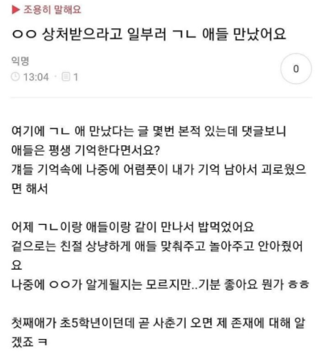 'ㄱㄴ'의 두 번째 뜻은 기혼남을 의미합니다. 기혼 남자, 기혼 남성을 줄여 기남이라 표현하고 이를 초성체로 바꿔서 'ㄱㄴ'이라고 표현한 것이죠. 이렇게 'ㄱㄴ'을 '기혼남'으로 사용하는 커뮤니티는 거의 대부분 여초 커뮤니티라고 보면 됩니다. 여초 커뮤니티에서 아내가 있는 남자와 불륜을 저지르고 그 남자와 관련된 이야기를 꺼낼 때 '불륜남'이라고 표현하기보다는 그나마 덜 자극적인 말인 '기혼남'인 'ㄱㄴ'으로 쓰는 것이죠.