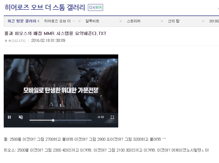 참고로 저기에 나온 숫자들은 MMR(MatchMaking Rateting)으로 게임을 할 때 실력이 비슷한 사람을 만나게끔 해주는 점수라고 보시면 되는데 여하튼 히오스 MMR 매칭 시스템을 설명하는 부분에서 어케이겼노x발련ㄴ아가 사람들로 하여금 그냥 웃기고 빵 터지는 사람들이 많아서 드립이 된 패턴이죠.