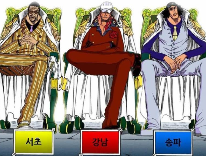 먼저 원피스 작품 속 삼대장입니다. 이들은 세계정부 최고전력이라고 칭할만큼 강력한 전투력을 지니고 있습니다. 위의 이미지가 제일 대표적인 이미지인데요, 왼쪽부터 키자루, 아카이누, 아오키지라는 이름을 가지고 있죠. 작가의 경우 이들을 굉장히 위엄있게 그렸지만 받아들이는 입장에서는 그렇지 못한 경우가 대부분이었습니다. 특히나 왼쪽 키자루의 경우는 짱구는 못말려의 등장인물 원장선생님과 비슷한 옷에 선글라스까지 같아 패러디되는 모습도 있어서 이 삼대장 역시 종종 패러디 요소로 사용됩니다.