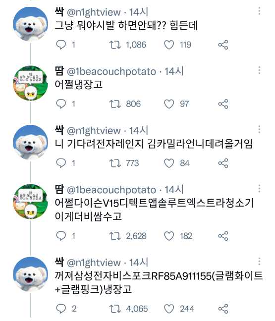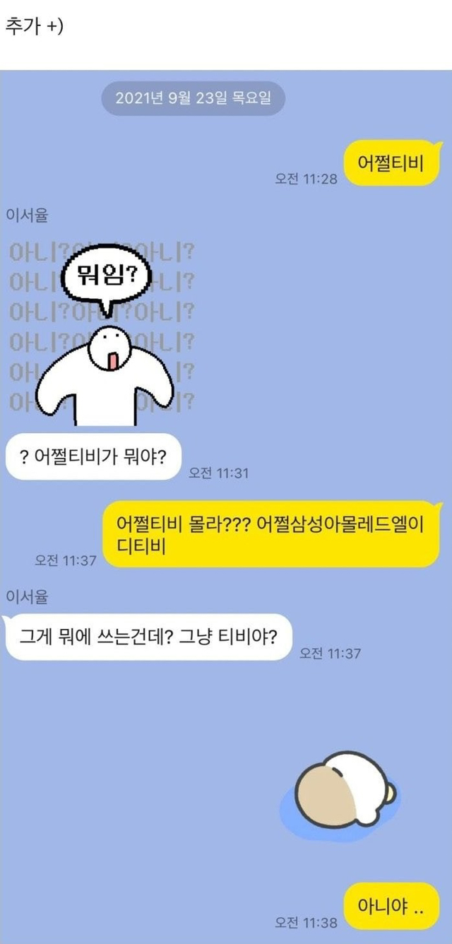 위에 뜻 부분에서는 '어쩔' 뒤에 다른 가전제품을 붙이면 된다고 했지만 또 다른 트위터 유저들은 '저쩔티비'라고 받아치는게 국룰이라고 합니다.