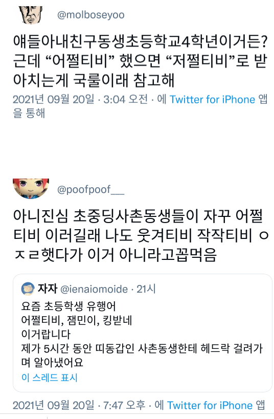 그렇게 트위터 상에서 초딩들의 유행이라는 어쩔티비를 보고 실제로 조카들에게 사용한 한 이모의 글이 올라왔습니다. 초등학생 조카 두명에게 어쩔티비라는 말을 사용했지만 둘 다 그게 뭔지 모르는 상황이죠. 이러한 이유로 과연 실제로 초등학생들 사이에서 유행하는지는 잘 모르겠습니다.
