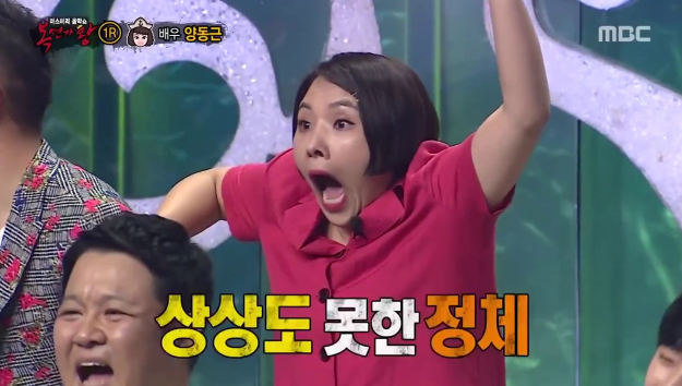 복면가왕을 보신 분들이라면 알겠지만, 이렇게 패널들이 놀라는 반응은 흔한 반응입니다만 신봉선이 이렇게 놀라는 장면은 신봉선의 강렬한 표정과 '상상도 못한 정체'라는 자막, 그리고 팔 방향이 위 아래로 나뉘어서 놀라는 기묘한 몸동작까지 절묘하게 시너지를 일으키게 됩니다.