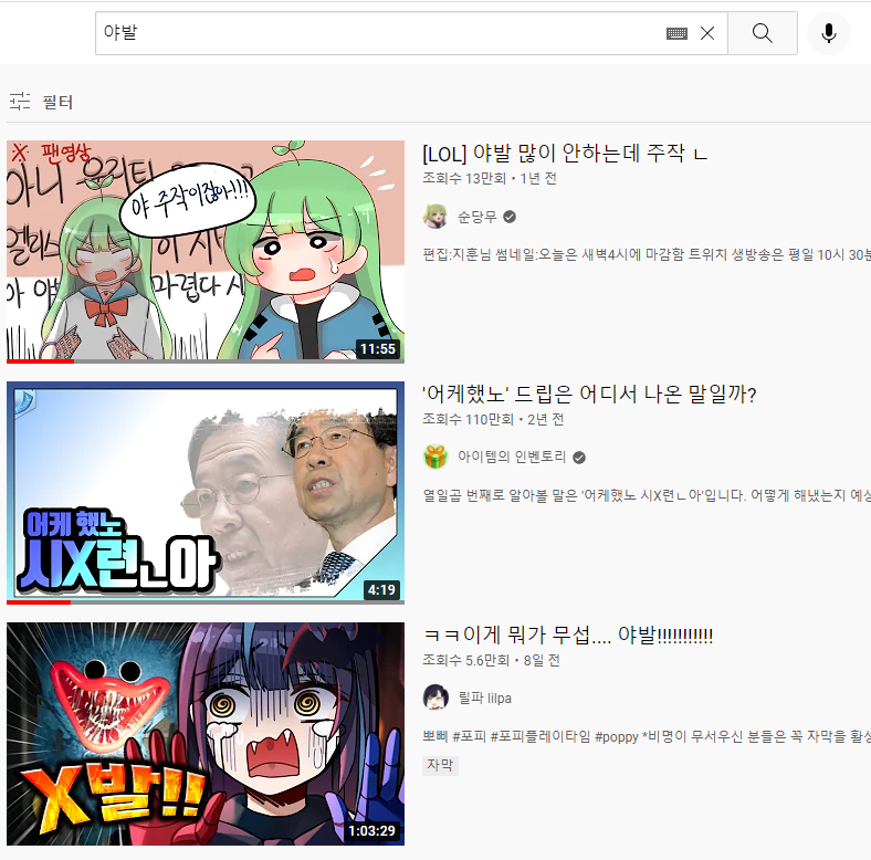 보면 알 수 있듯이 인터넷 커뮤니티에서도 자연스럽게 사용하며 또한 유튜브에다가도 '야발'을 검색하면 욕설이 필터링되어 나오는 경우가 많습니다. 그냥 '씨X'을 사용하는 대신 '야발'을 사용하는 것으로 '씨X'이란 말을 사용하는 모든 상황에서 치환하여 사용가능합니다. 예를 들어 '아 씨X 개못하네'는 '아 야발 개못하네'로 '그게 뭔데 X발련아'는 '그게 뭔데 야발련아'로 이런 식으로 말이죠.