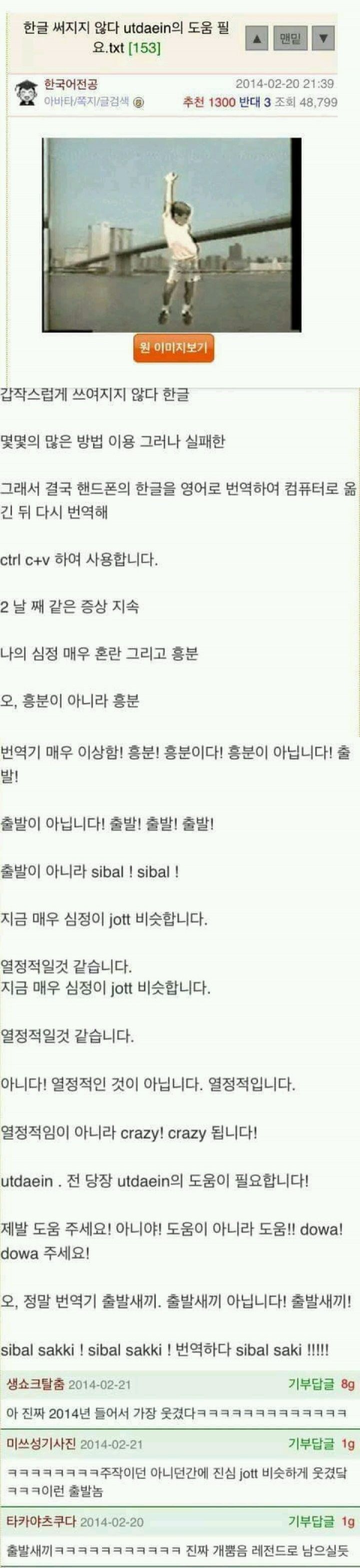 바로 다음날인 2014년 2월 21일, 해당 작성자는 위와같은 글을 하나 더 올렸는데요, 글에 의하면 롤을 하다 배치고사에서 브론즈2를 배치받고 화가나서 키보드에 샷건을 갈겼고, 그로 인해 키보드가 부서졌다는 내용입니다. 그러면서 절대로 물건을 부수지 말라며 만약 부순다면 자신과 같은 ㅈ같은 인생을 살 것이라고, 더불어 구글 번역기는 ㅆㅂ새끼라고, 개새X라는 등 내용이 있습니다.