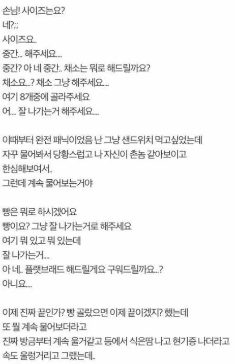 미리 검색해서 메모장에 멘트까지 적어두고 연습했지만 순서가 생각했던 것과 달랐고 더불어 연습한 멘트에 있던 야채랑 소스가 다 나가버리는 바람에 뇌정지가 와서 엉엉 울었다는 썰입니다. 안타깝게도 결국 주문도 제대로 못하고 나와버렸다는 작성자...