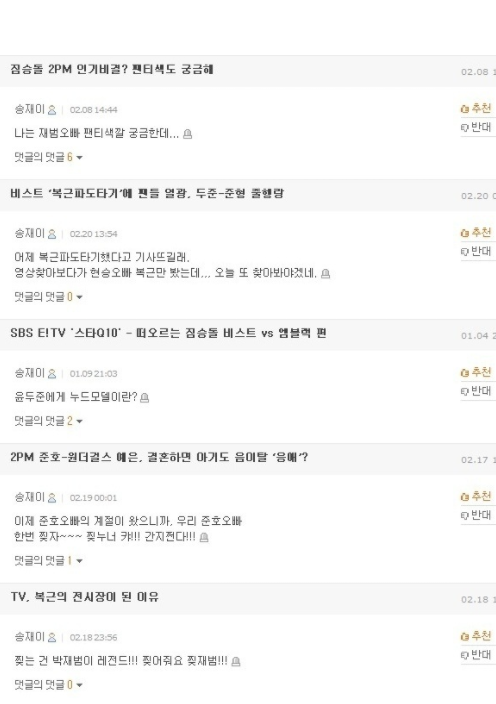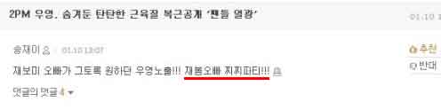 그중에서도 제일 눈길을 끄는 것은 바로 위의 댓글이었는데요, '2PM 우영, 숨겨둔 탄탄한 근육질 복근공개 팬들 열광'이라는 기사에 댓글로 "재보미 오빠가 그토록 원하던 우영노출!!! 재봄오빠 찌찌파티!!!"라고 달았고 이게 가장 임팩트가 커서 많은 사람들에게 여성이 성 상품화에 대해 지적하는 반면 남성 성 상품화는 즐기는 내로남불의 대표로 자리잡게 되었죠.
