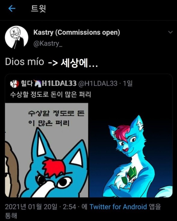 위의 짤은 2020년 3월 스페인어권 트위터 유저가 올린 트윗입니다. 퍼리(수인)를 좋아하는 사람들이 수백만 원짜리 퍼리 슈트를 사거나 혹은 많은 돈을 주고 커미션으로 퍼리 팬아트들을 의뢰하는 것을 보고 퍼리를 좋아하는 사람들은 뭘 하길래 돈이 많은지 모르겠다는 의미의 짤이었습니다. 해당 짤이 2021년 1월 한국에서 퍼지기 시작하며 '수상할 정도로 돈이 많은 ○○'으로 퍼지더니 이게 번형되어 '수상할 정도로 ~한 ○○'로 퍼지게 된 것입니다. 이처럼 보면 알 수 있듯이 퍼리에서 시작되었기 때문에 주로 퍼리 관련 영상이나 글을 보면 댓글에 '수상할 정도로 ~한 ○○'라는 내용을 쉽게 볼 수 있습니다.