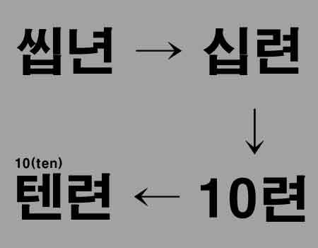 보통 '씹년'이라는 표현을 사용할 때 '씹련' 또는 '십련'으로 많이 사용합니다. 여기에서 '십련'의 '십'이 숫자 십(10)과 동음이의어인 것을 이용하여 '십'을 영어 10을 뜻하는 '텐(ten)'으로 바꾼 것입니다. 간단하게 설명하면 '씹년' -> '십련' -> '10련' -> '텐련' 이런 과정입니다. 많은 사람들이 욕을 직접적으로 사용하는데 있어서 거부감을 갖기도 하고 더불어 욕설의 경우 인터넷 공간에서 사용하는 경우 필터처리가 되곤 합니다. 그렇기 때문에 이런 식으로 단어를 변형하여 사용하는 것입니다.