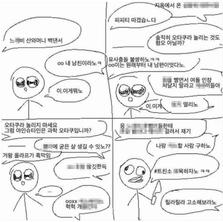 너무 난잡해서 적당히 모자이크 했는데 사실 어차피 웹툰에서도 대화에 모자이크 되어있어도 너무 눈에 익다보니 자연스럽게 읽히시는 것 처럼 다 해석 가능하실거라 믿습니다.