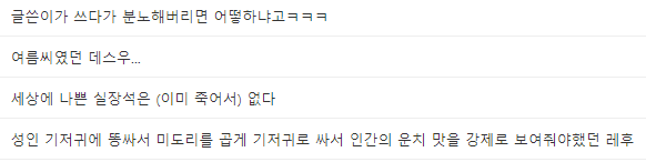 이렇게 이번 시간에는 데스웅, 레후, 데챠앗, 테챠앗 등 참피체에 대해서 알아보았습니다. 뭐, 사실 대충 작품들을 찾아보면 알 수 있겠지만, 학대물이 많은 만큼 사람에 따라 거부감이 들 수도 있습니다. 또 여기서 유래된 말투인지 모르고 그냥 무조건 사용하는 사람도 있을거구요. 그러면 이번 포스팅은 여기서 마무리하도록 하고 다음번에는 또 다른 글로 다시 찾아오도록 하겠습니다. :)