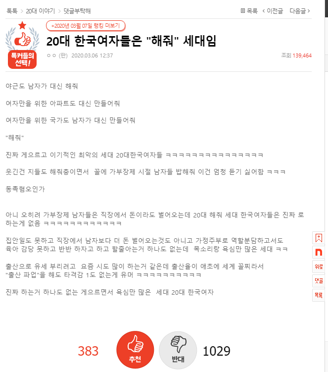 2020년 네이트판에 올라온 위의 글이 2021년 재조명되면서 반페미니즘 정서가 강한 남초 커뮤니티들에서 크게 공감하며 "해줘"라는 말이 유행어처럼 사용되기 시작했습니다. 어떻게 보면 여자들을 비판하기 위해 시작된 말이었지만 점점 시간이 흐르며 남녀갈등적인 의미는 없어지게 되었고 단순히 자신이 귀찮을 때, 억지를 부릴 때 "해줘"라며 드립으로 사용하게 되었습니다.