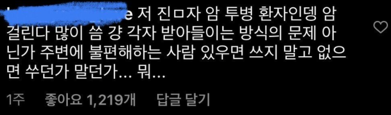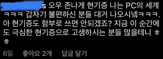 실제 PTSD 환자들이 겪는 고통을 생각하면 PTSD 온다라는 표현을 쉽게 사용하면 안된다고 말합니다. 그러나 개인적인 생각은 다른데요, 단순히 드립으로서 사용하는데 있어서 실제 PTSD 환자들의 기분까지 생각해야 할까요? 그렇다면 '대머리', '빡빡이'같은 표현도 탈모로 고통받는 사람들을 생각하면 사용하지 말아야 한다라는 논리와 같습니다.
