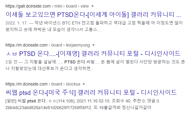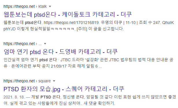 위의 문단에서 서술했듯 PTSD는 하나의 정신적 질병으로 실제로 겪는 사람들은 일상생활에 지장을 줄 정도로 힘든 경우가 많습니다. 다만 인터넷 커뮤니티나 인터넷 방송, 유튜브 영상 등에 'PTSD 온다'라는 표현은 대부분 실제로 PTSD 증세가 나타나는 것이 아닌, 단순히 과거에 좋지 않은 경험이나 기억이 떠오른다는 뜻으로 사용합니다.