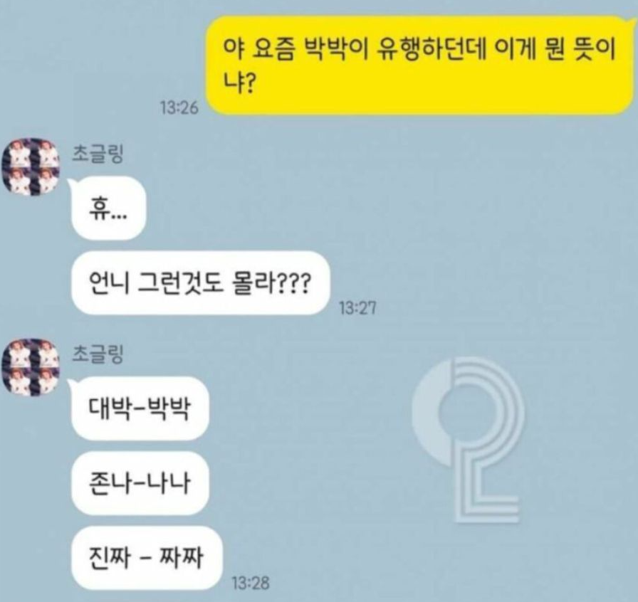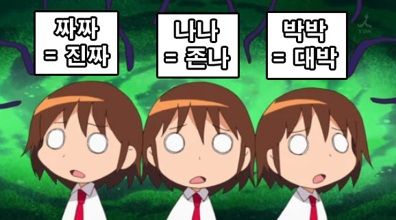 어느날 여러 SNS에서 '요즘 10대들 사이에서 유행하는 신조어'라는 제목으로 10대들이 진짜를 '짜짜'로, 비속어 ㅈ나를 '나나'로, 대박을 '박박'으로 사용한다는 글이 퍼졌습니다. 워낙 처음 보는 말들이라 댓글들에는 진짜로 요즘 10대들이 이런 말을 쓰냐는 의문이 많이 발생하였고, 그러면서 점차 퍼져나가게 되었습니다. 그렇게 퍼져나간 이후에서야 주변에서 가끔 쓴다는 사람들이 보인 것으로 보아 처음에는 억지였지만, 이후 어느정도 인기를 얻어 간간히 사용되곤 합니다.
