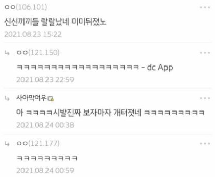 다른 곳들보다 과격한 언동이 많은 인터넷 커뮤니티 디시인사이드에서는 해당 글에 '신신끼끼들 랄랄났네 미미뒤졌노'라는 댓글을 달기도 했습니다. 무슨 뜻인지는 적당히 짜짜 나나 박박과 같은 규칙을 대입해서 생각해보면 금방 유추해낼 수 있을겁니다.