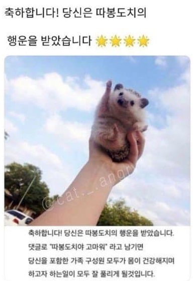 인터넷 커뮤니티의 낚시글 따봉도치로부터 유래되었습니다. 제목에는 호기심을 끌 만한 글을 적어놓고 막상 들어가면 따봉을 하고 있는 고슴도치 사진과 함께 내용에는 "축하합니다. 당신은 따봉도치의 행운을 받았습니다."라며 댓글로 "따봉도치야 고마워"라고 작성하면 무언가 잘 풀린다는 그런 낚시성 게시글이죠. 낚인 사람들은 자신들이 낚인 것을 알면서도 사진 속 따봉을 하고 있는 고슴도치가 귀여워서 댓글로 "따봉도치야 고마워"라고 남기기도 했습니다.