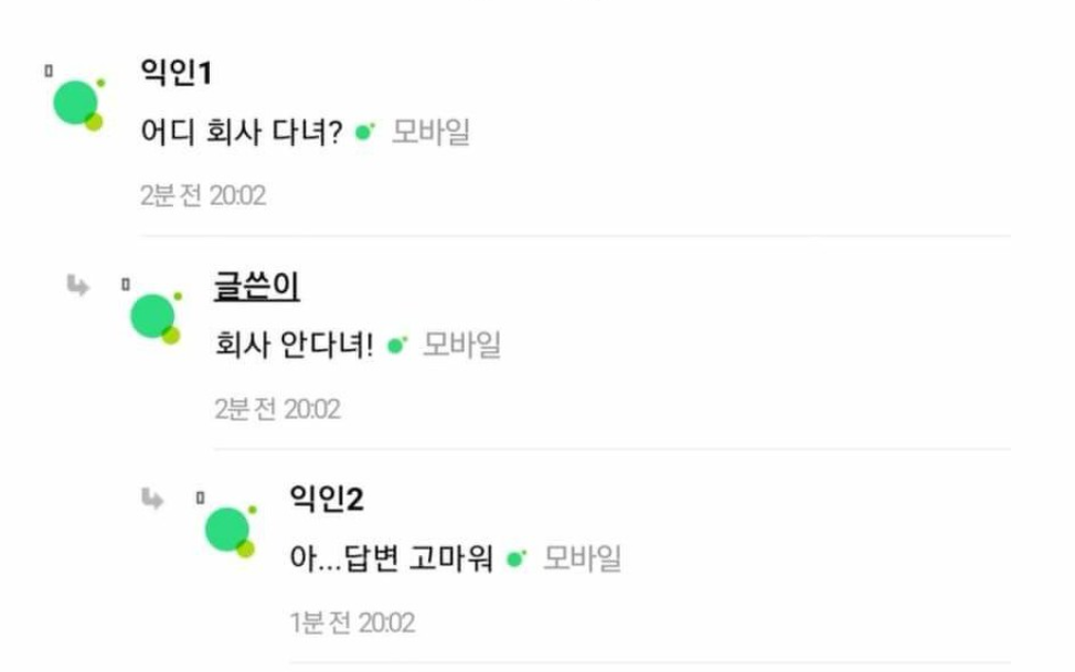 여초 인터넷 커뮤니티중 하나인 인스티즈에서 '빨리 여자들의 삶이 개선됐으면 좋겠다'라는 제목으로 글이 올라옵니다. 해당 글의 내용은 생리인거 숨기고 싶지 않으며 화장 안하고 출근해도 화장 안했냐면서 외모비하발언을 듣고 싶지 않다는 등의 이야기를 합니다. 사실 글만 보면 글 작성자는 회사에 다니고 있으며 저런 직장 내 성희롱을 겪는듯한 뉘앙스입니다만, 누군가가 댓글로 "어디 회사 다녀?"라고 질문을 합니다. 그에 글작성자는 "회사 안다녀!"라고 당당하게 답변을 달았습니다. 이어 질문을 한 사람은 "아...답변 고마워"라고 답글을 달았죠. 회사를 다니지도 않으면서 직장 내 성희롱을 비판한 점, 어디 회사 다니냐는 질문에 당당하게 느낌표까지 붙여가며 자신이 회사를 다니지 않는것을 밝힌 점, 마지막으로 질문을 했던 사람의 뭔가 뻘쭘함이 묻어나는 고마움까지 합쳐져서 여러 많은 커뮤니티로 퍼지게 됩니다.