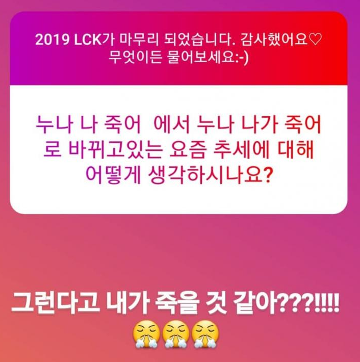 위에서 '오빠 나 죽어'라는 말의 뜻과 유래를 알아보았는데요, '누나 나 죽어'도 비슷한 맥락의 표현이라고 생각하시면 되겠습니다. 다만, '누나 나 죽어'가 유행하게 된 이유는 아이돌과는 관련이 없고 롤이라는 게임의 대회에 있습니다. 게임 롤의 대회인 LCK에서 김민아가 분석데스크 및 경기 후 인터뷰를 담당하게 되었는데요, 롤이라는 게임은 현 10대도 그렇고 20대 남성 대다수가 해봤다고 말할 수 있는 인기게임입니다.