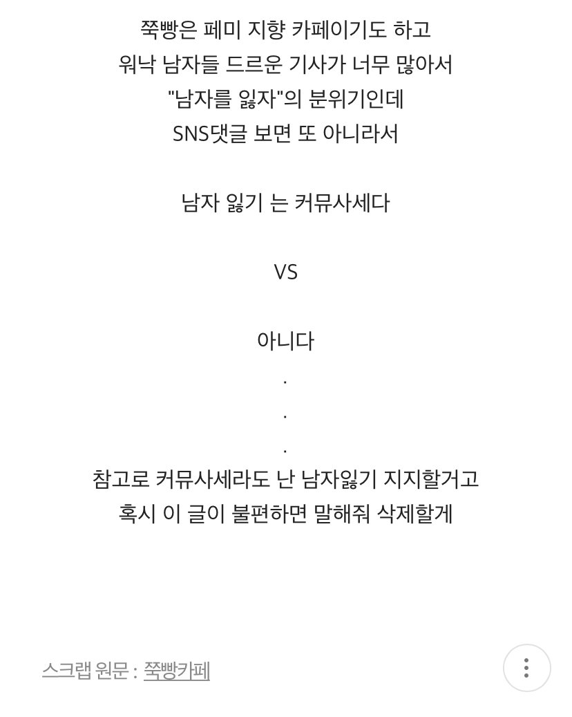 해당 글은 여초 커뮤니티에 올라온 글을 다른 여초 커뮤니티가 퍼가서 질문을 남긴 것입니다. 해당 여초 커뮤니티들은 남성혐오가 만연한 커뮤니티들로, 대부분 구성원들이 남성을 혐오하곤 합니다. 해당 글에 나와있는 '남자 잃기'는 아마 비연애, 비혼을 의미하는 것이라 추정됩니다. 해당 커뮤니티 활동만 하다보면 우리나라의 여성들 대부분이 남성을 혐오하고 비연애, 비혼을 지향할 것 같지만 실제 현실은 그런 커뮤니티에서 활동하는 사람들조차 연애, 결혼하는 사람들이 많다는 것입니다.