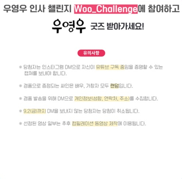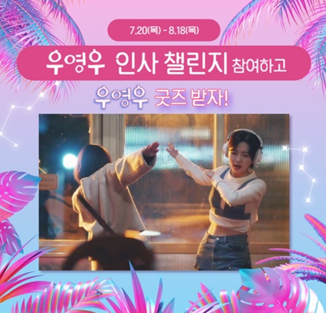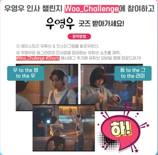 이상한 변호사 우영우의 제작사인 에이스토리는 우영우 인사법이 덩달아 화제가 되자 우영우 인사 챌린지를 진행했습니다. 방법은 우영우 인사법으로 인사하는 장면을 찍어 유튜브 쇼츠에 올리는 것인데요, 1등 1명, 2등 30명, 3등 50명으로 총 81명에게 상품을 지급한다고 합니다. 평가 기준은 좋아요 갯수가 50%, 관계자 투표가 50%이며 응모기간은 7월 20일부터 8월 18일, 당첨자 발표는 9월 10일 목요일 에이스토리 유튜브&인스타그램에서 발표한다고 합니다.