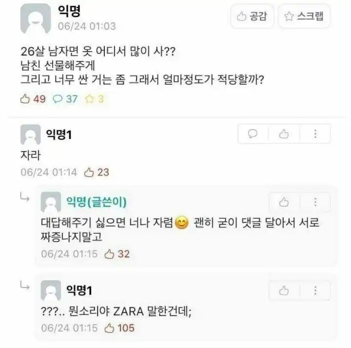 대학생 커뮤니티 에브리타임에 누군가가 남자친구에게 옷을 선물하기 위해 남자들이 옷을 어디서 많이 사는지 물어봤습니다. 이에 한 유저는 '자라'라고 말했고, 이에 글쓴이는 '대답해주기 싫으면 너나 자렴, 괜히 굳이 댓글 달아서 서로 짜증나게 하지 말고'라고 말했습니다. 이에 답변을 해준 사람은 다시 '???.. 뭔소리야 ZARA 말한건데;'라고 답글을 달았죠.